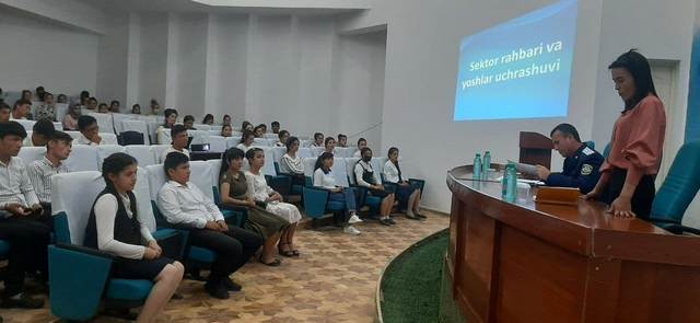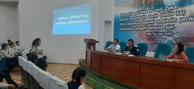 MFY ибн Сина в пешковском районе в афшанском техникуме общественного здравоохранения имени Абу Али ибн Сины в пешковском районе в сотрудничестве с хокимиятами Пешковского района, районной прокуратурой, районным отделением агентства по делам молодежи Узбекистана, районным советом союза молодежи Узбекистана, районным отделом народного образования, районным отделом махалли и поддержки семьи, а также рядом организаций Узбекистан в связи с 30-летием независимости Азербайджанской Республики "Новая молодежь Узбекистана, давайте соберемся вместе!"под девизом "месяц молодежи" была организована встреча "руководитель сектора и молодежь" с участием Главы 2-го сектора района. В ходе встречи молодежь высказала руководителю сектора ряд предложений и обращений. Обращения направлялись в соответствующие организации в зависимости от их содержания, а их исполнение строго контролировалось.